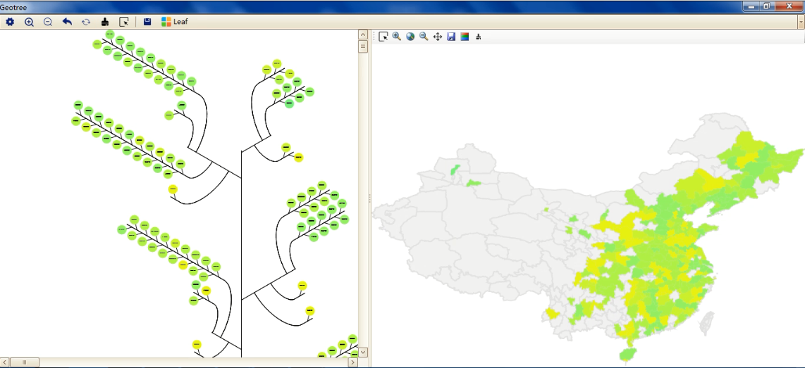 GeoTree软件是由中国科学院地理科学与资源研究所201空间研究组研发,采用“树”状结构探索时空分类演化现象的计算机可视化探索性分析软件。对于具有演化机制的时空过程,可以利用横断面数据重构其分类时间演化过程,将多维数据中隐藏的机理关联和演化变异以“树”状结构清晰的表现出来,可用于区域演化的预测预报,用于进一步理解相关的环境与社会经济现象及其变化趋势。